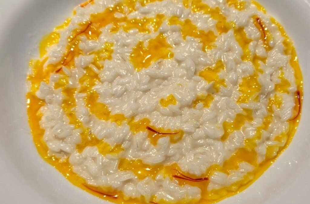 Parmesan risotto with saffron cream. Velvety on the palate, the intense flavor of saffron knocking discreetly on the surface.